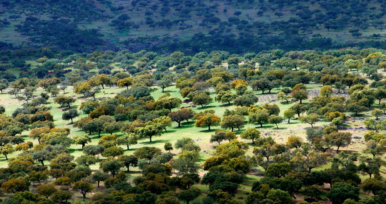 Dehesas in Extremadura consist predominantly of Holm Oak, which is replaced by Cork Oak on the richer, more humid soils at the base of the mountains. Occasionally, you can also encounter dehesas consisting of Portuguese and Pyrenean Oaks and, more rarely, Narrow-leaved Ash. These oddly orchard-like stands of oak cover 1.43 million hectares, about a third of the land of Extremadura, but are rare outside the region except for in adjacent Andalucía and Portugal. Extremadura holds about 35% of the world’s dehesas and is therefore called the ‘heartland’ of the dehesa.