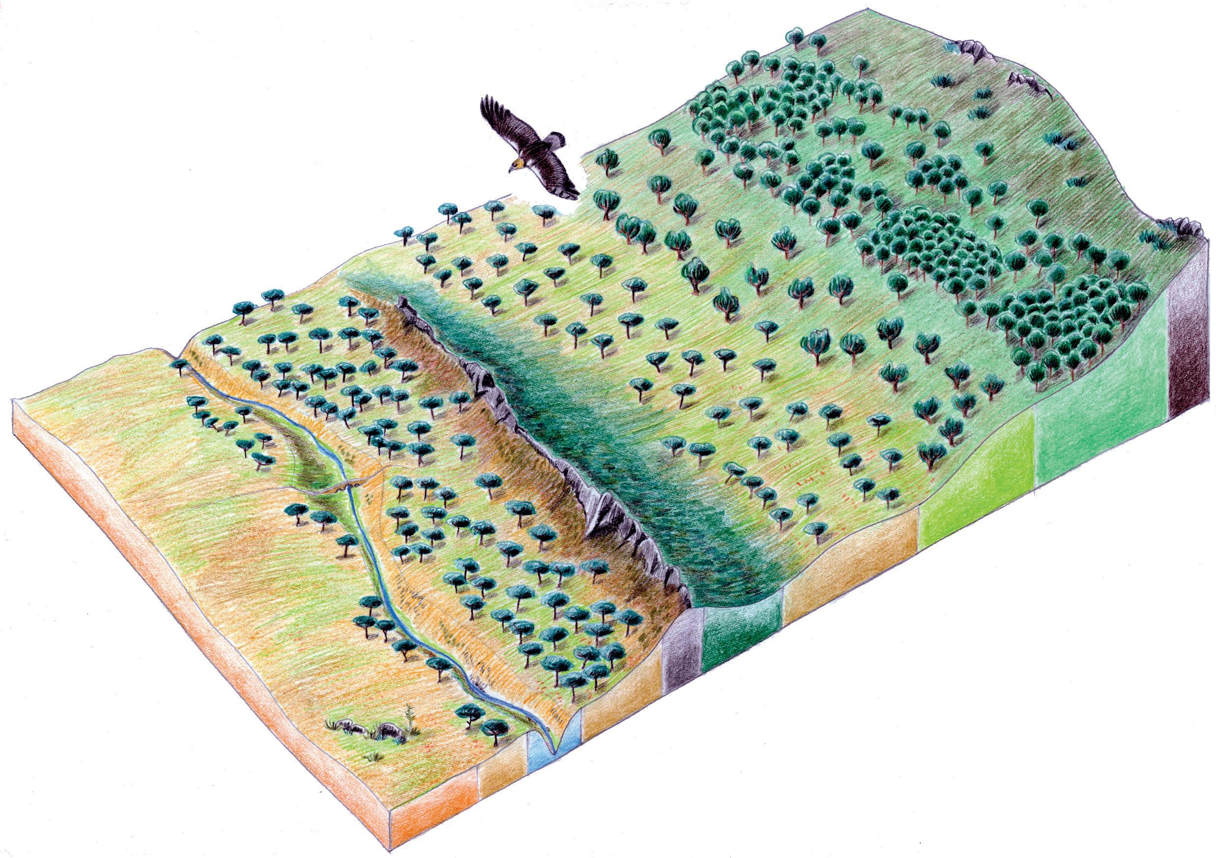 The dehesa ecosystem revolves around the establishment and disappearance of pasture. If you were to photograph a single dehesa over the years, you would see it change from a loosely planted cereal field into a pasture and then into scrubland (see illustration on page 31).
