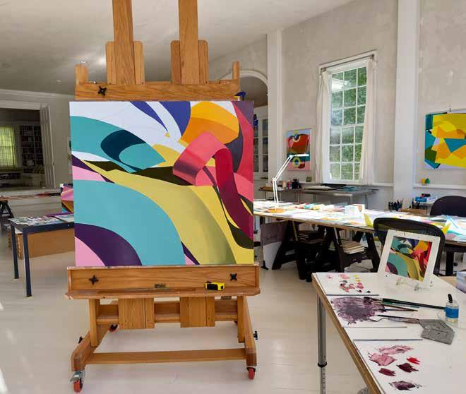 Like the Artifact Color collages, the Interlusion paintings convey a mysterious sense of landscape—”the synthesis of imagination and dreamscape,” Gardiner calls them. For four years she explored in this series the varying effects she could create with different color and shape combinations, creating some 25 colorful, playful canvases. But by late 2022, she felt it was time to investigate new areas. “I wanted more rigor, more bold curves, more shapes, more sculptural elements,” she says. She began the Interlusion series while she was caring for her husband, Jonathan Phillips, as he battled stage four lung cancer, and it was shaped by her grief following his death in March 2020. “It was a very meditative period, very quiet,” she says. “Then, in 2022 going into ’23, I was gaining back more strength as I was going into my third year of mourning. The dreamlike, surreal quality of Interlusions wasn’t expressing my physicality. I needed to shake things up.”
