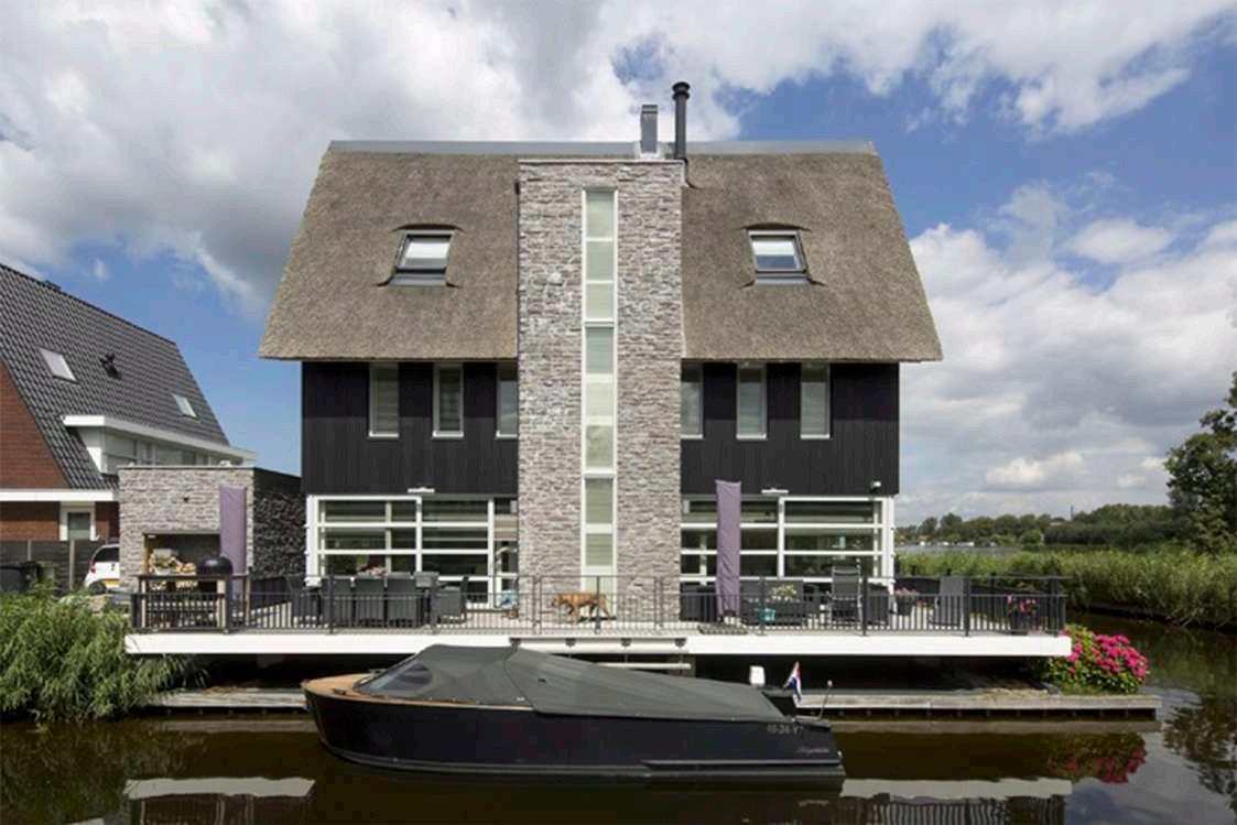 Red masonry houses with characteristic windows and a vari ety of roofs with large overhangs now define the image of the neighbourhood. Along the Spaarne river four special houses are situated, with façades made out of slate and wood and with outstanding thatched roofs. Their terraces stand amidst the reed and each house has its own boat pier. This is living at a spectacular and historical location.