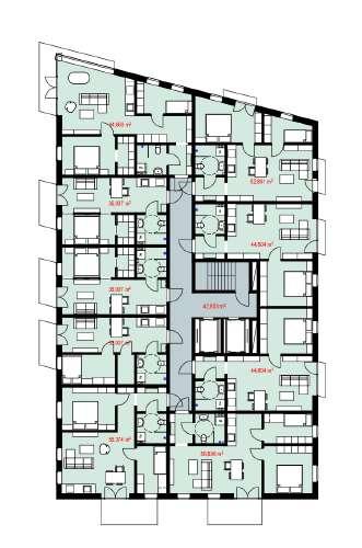 Because there is a height difference in the surrounding area of approximately 2.5 m, parking could be facilitated on ground lev el. The facade on the inside of the block is more open with hor izontal lining while the outer facade appears much more solid, folded around the building.