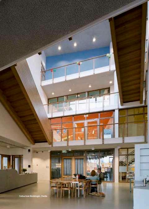 The Cultuurhuis in Zwolle comprises all cultural (public) func tions for the Stadshagen expansion zone with ultimately 10,000 residents. It is an obvious meeting point at the heart of the dis trict. It contains amenities such as a library, the music school, a creative centre, the information centre, the crèche, local coun cil services, but also more informal functions: the hall is fitted out such that exhibitions can be organized here, but also so that one part can be partitioned off to permit simple presentations. There are rooms incorporated for youth events, for the editors of the district newspaper, local clubs and societies etc.