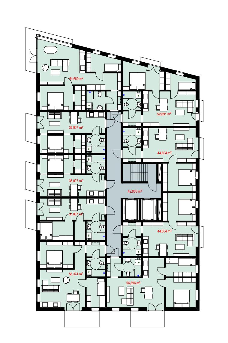 The footprint is simple without indentation and entrances are clearly marked and well-lit to avoid hidden and dark areas. The sharp angle makes for a dramatic view both from inside and out. The ground floor is largely transparent with glazed corners that allow to see through the corners on this compact site and ensure a good visual connection between inside and outside to increase social security in the community.