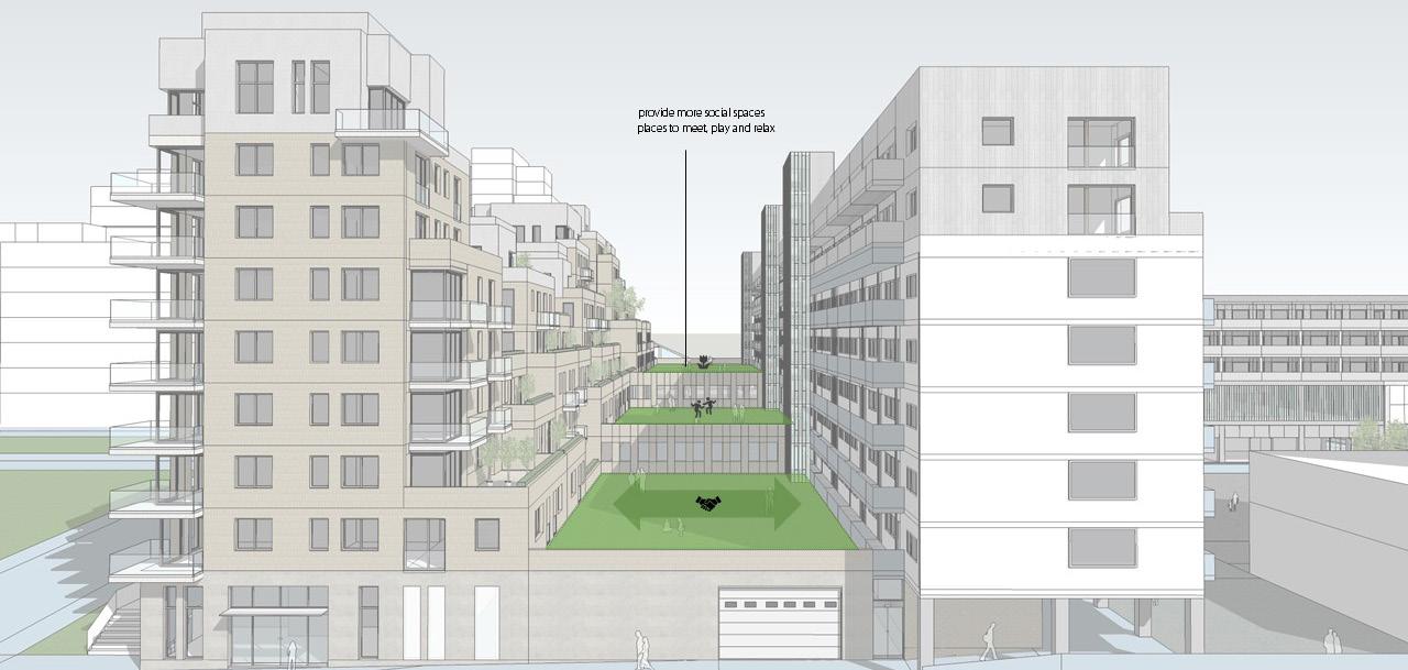 Social roof gardens reinforce a sense of community and secu rity. Backstreets become front streets with entrances to shops and housing on all sides. The center focuses on pedestrians and cyclists, better accessibility and direct connections with public transportation. An underground car parking garage allows the car park to be converted into a flexible public square, to host markets or other events.