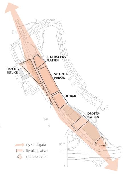 The existing sports halls are worn and too expensive to reno vate. The new proposed location closest to the E4 would en sure that the existing halls remain in operation until the new ones can be taken into use. We see good opportunities for the abandoned indoor swimming pool site to be redeveloped with elderly housing, rental housing, preschools and shops. The site for the existing preschool can be developed into a park and strengthen a today partly worn, partly underutilized green area.