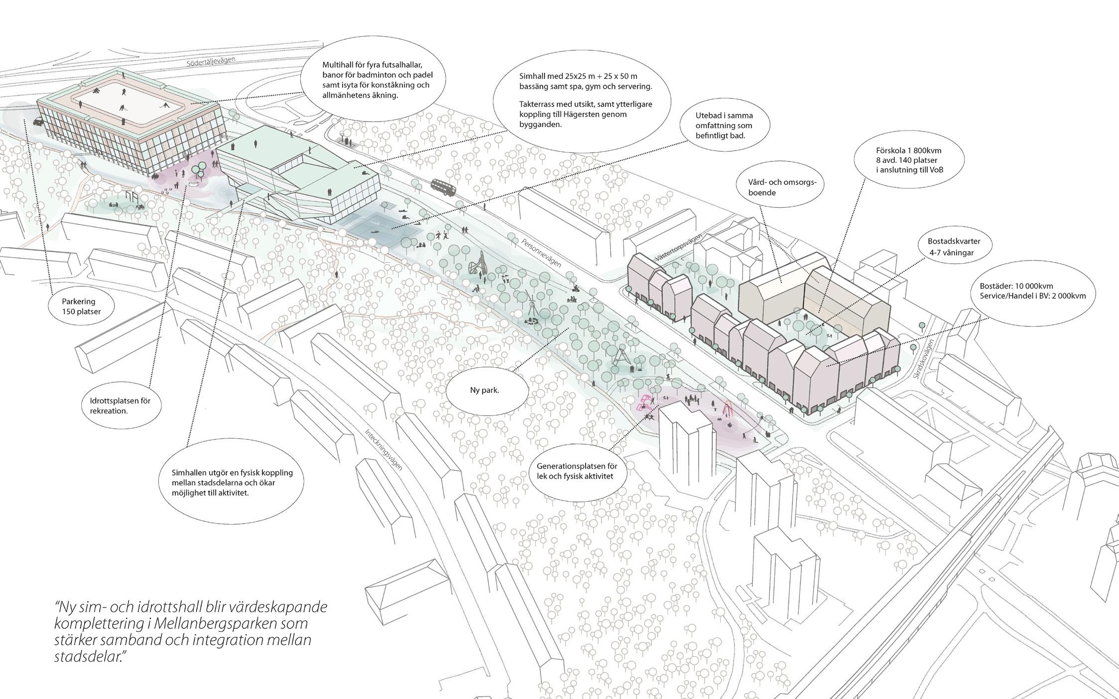 Our proposal involves the development of two plots in two stages. These two can contribute to attractiveness and city life, new places to meet and work. We also suggest that more of the stretch consisting of Mellanbergspark will be restored as a green area - also important for a healthy and sustainable life.