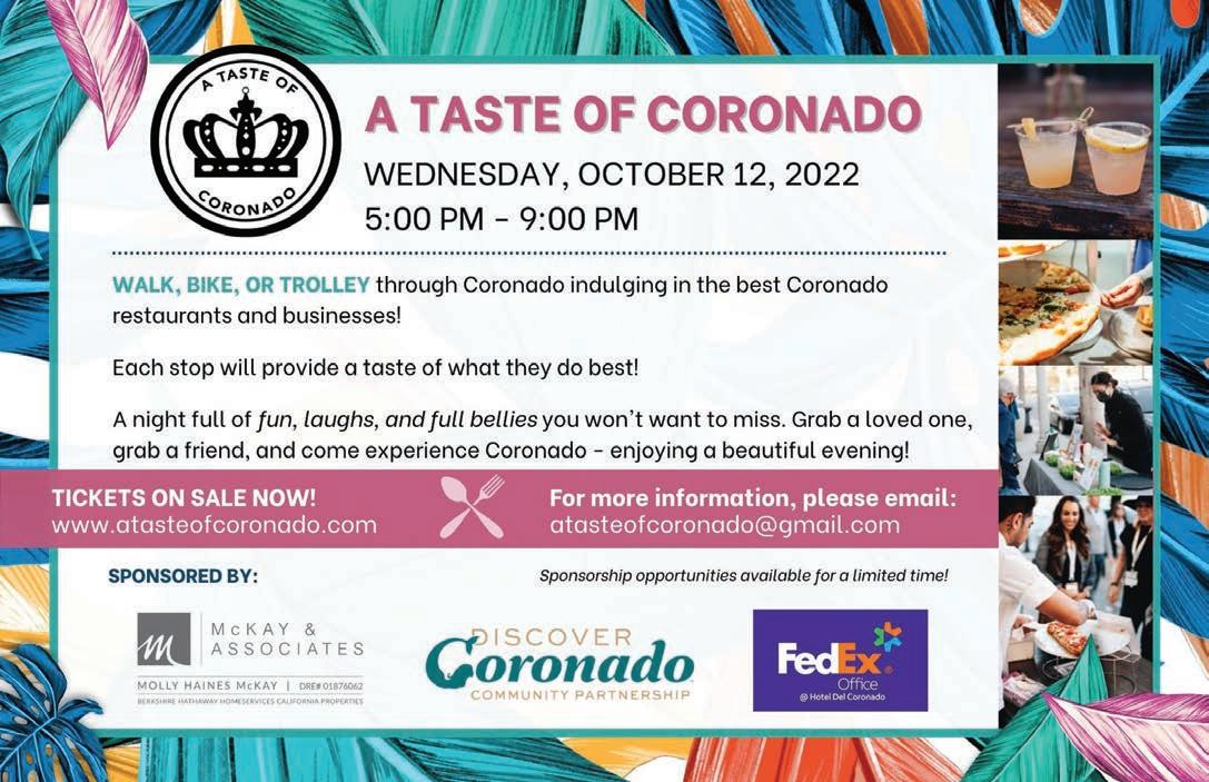Coronado Junior Woman’s Club is honored to serve our community. We tailor our donations to organizations that support women and children in Coronado and San Diego. Please visit our website coronadojuniorwomansclub.org for ways to join or donate! For tickets to A Taste of Coronado, happening from 5-9 pm on Wednesday, October 12, please visit atasteofcoronado@gmail.com