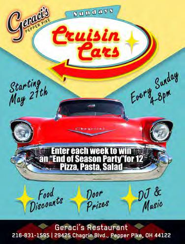 Geraci’s Pepper Pike Restaurant, Cruisin’ Cars every Sunday Just off I-271 & Chagrin Blvd. Every Sunday 4-8pm thru Sept. DJ, Food Discounts, Door Prizes & enter weekly for an ‘End Of Season Party’ for 12 guests: Pizza, pasta & salad 29425 Chagrin Blvd Pepper Pike, Pepper Pike OH 44122 Chris 440-897-0492 May 21, to September 24