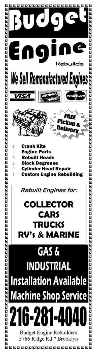 CALL TODAY! 216.261.0066 • www.semeandson.com Visit us at our Shop in Euclid, OH Just South of Route 2 at 1320 East 260th St. Euclid Ohio 44132 • Complete Machine Shop Services • Engines 1900s-1980 • Engines Balanced & Blueprinted • Engine Installs, detailing & more • Carburetor Rebuilds AMERICAN STREET RODS “Tanker” the official shop greeter! HAVE A PROJECT? We are currently scheduling projects for the winter. Next year has to be better than the last. People will