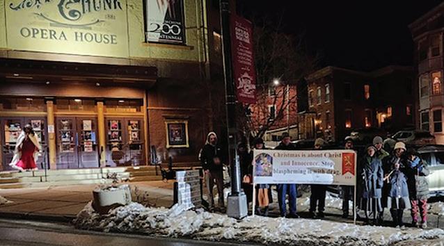 A group of concerned Catholics held a protest rally outside Mauch Chunk Opera House in Jim Thorpe, Pennsylvania, to make reparation against a “Christmas” drag show.