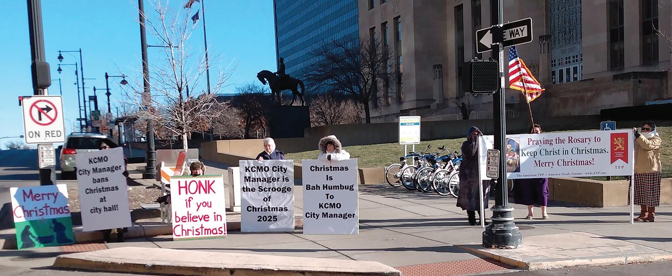 In Kansas City, Missouri, captain Francis organized a Public Square rally to protest a decree from city officials that religious symbols would not be allowed at city hall, although secular decorations were permitted. Francis said they received many honks of support from passersby.