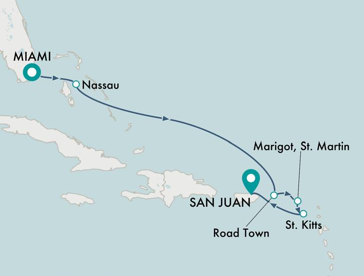 Starting in Miami, you’ll begin sightseeing in Nassau before recharging with two gentle sea days. Next, enjoy Tortola’s sharp peaks and bougainvillea-clad hillsides before beautiful Marigot and its pristine beaches. Sail next to Puerto Rico’s romantic capital, San Juan, for disembarkation.