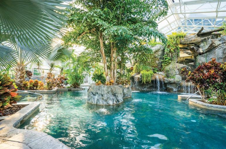 10,000 sq. ft. complex of exotic free-form heated pools, a spacious hot tub, sauna, steam room and waterslide all enclosed with advanced German Foiltec glass allowing year-round tanning and flourishing tropical plants.