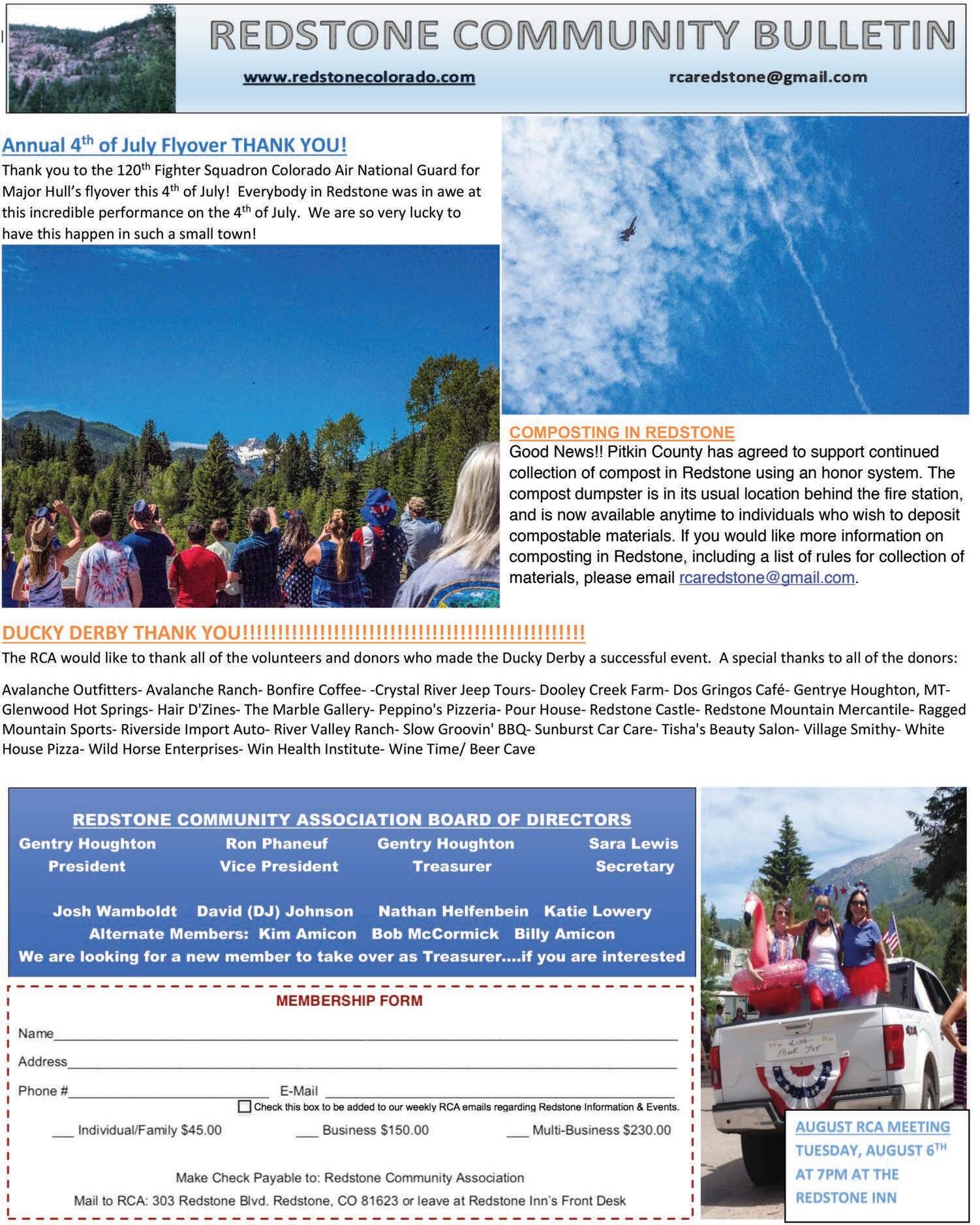 The Redstone Community Association meets the First Tuesday of the month at 6 p.m. at the Redstone Inn. All are welcome!