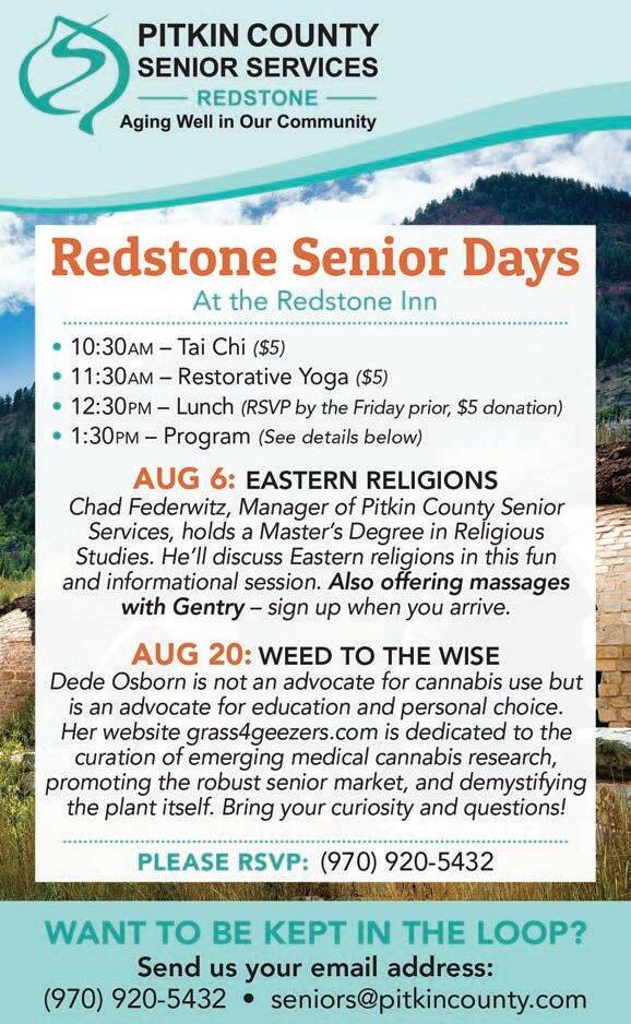 Aug. 3: 6 p.m. Marble Hub Volunteer Appreciation Dinner at the Hub. Contact the Marble Hub for more information 970-963-7300.
