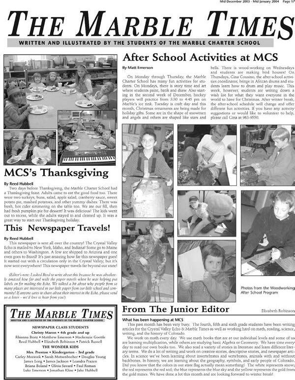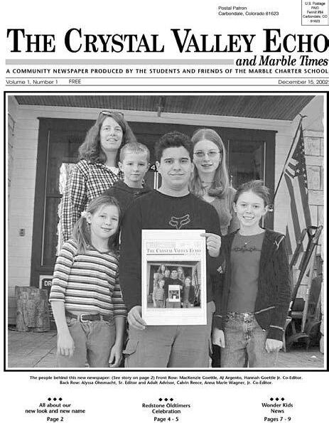 As I wrap up my time as Publisher of The Crystal Valley Echo, I would like to extend a sincere thank you to the people at The Marble Charter School, both past and present. It was December, 2002, when Wendy Boland was the director of The Marble Charter School, that The Crystal Valley Echo was born. Over the years, I had many opportunities to work with the both the students and staff of this incredible educational facility.