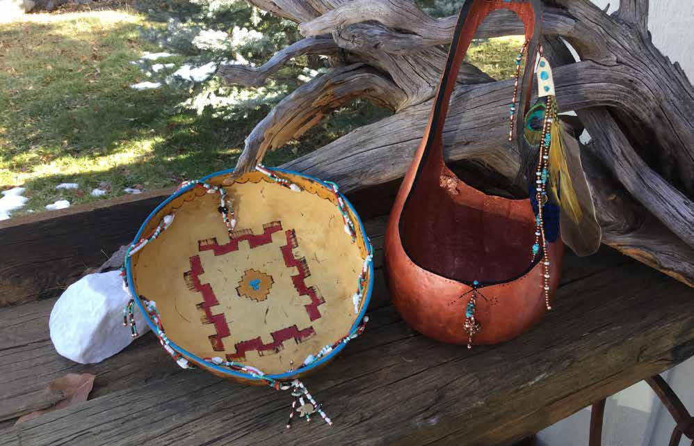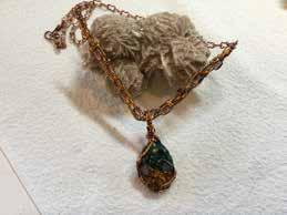 She works with mixed media. “From dried and pressed flowers, semi-precious stone beads, glass beads, wire weaving jewelry, photography, and gourd artwork,” Marty grins, “To name a few.”
