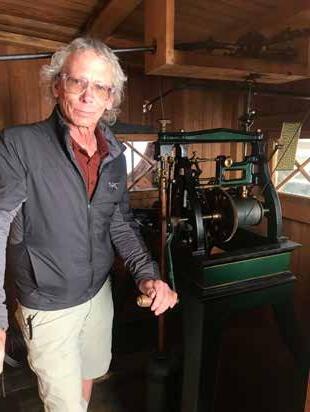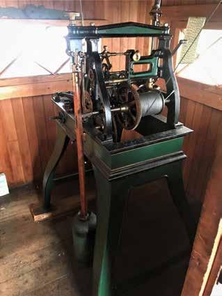 Fear not, potential future clock winders, this machine is no more complicated and menacing than Mr. Rogers in a comfy cardigan and slippers. And that is exactly what it is — a super-sized grandfather clock on steroids. It has a pendulum the size of a watermelon. This is its power weight, the equivalent of two bags of concrete that you wind up with a big crank periodically to keep the old boy ticking.