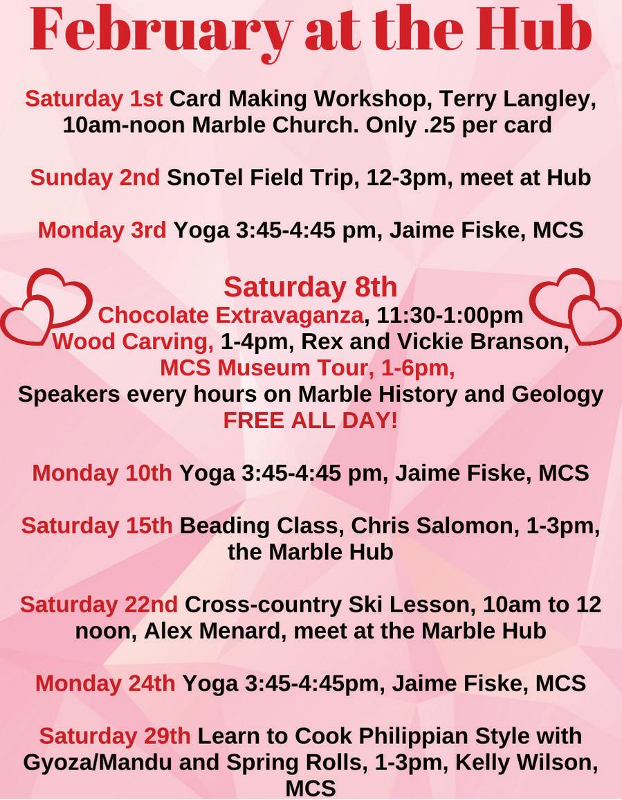 February 8 Second Saturdays in Marble, FREE: Marble Museum Winter Open House with History and Geology talks on the hour every hour, 1 p.m. — 6 p.m, see page ___ for full details. Chocolate Extravaganza Contest and Tasting, 11:30 a.m. — 1 p.m. plus wood carving, 1 p.m. — 4 p.m., with Rex and Vickie Branson at the Marble Charter School.