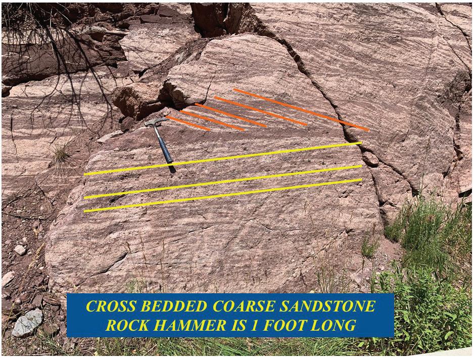 The stream forms ripple marks in the sandy river bottom because of unidirectional water flow, these ripple marks migrate downstream in the direction of flow. If these sediments are preserved by rapid burial by overlying sedimentary units, the migrating ripple marks appear as cross-bedding in the rock record (Figure 3).
