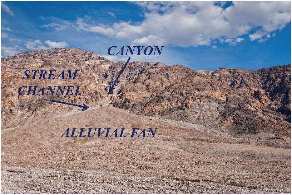 The combination of the dry climate with steep surrounding mountains created optimum conditions to develop alluvial fans. Rivers that flow from mountain canyons out onto the depositional plain create alluvial fans (Figure 1).