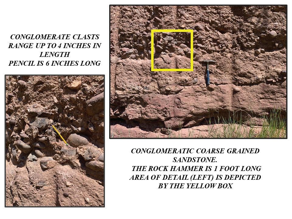 Alluvial fans are characterized by conglomeratic sandstones, coarse-grained sandstones, siltstones, and occasionally shales. Conglomerates contain large clasts (composed of fragments of pre-existing rocks and minerals) of variable size derived from the eroded mountains and deposited in relatively close proximity to the sediment source (Figure 2).
