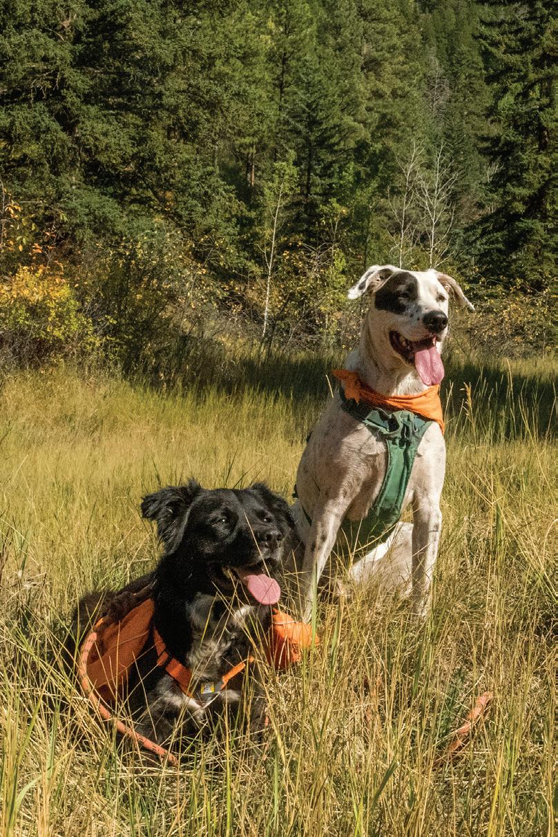 Below: Mazzy and Trace, dogs of The Crystal Valley Echo staff, show off their hi-vis gear.