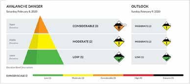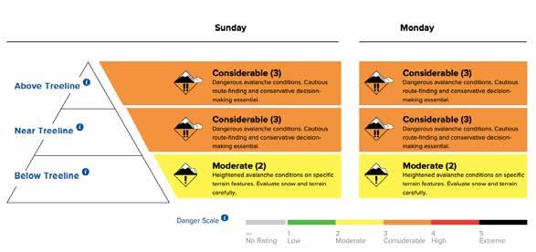 The first part gives an overall impression of an area. According to CAIC, their forecast model “relies on the North American Avalanche Danger Scale to communicate avalanche hazard.” This five-level scale conveys the potential avalanche danger to those recreating in the backcountry. The danger is a combination of the expected likelihood, size, and distribution of avalanches. It provides a basic description of avalanche conditions above, near, and below the treeline.