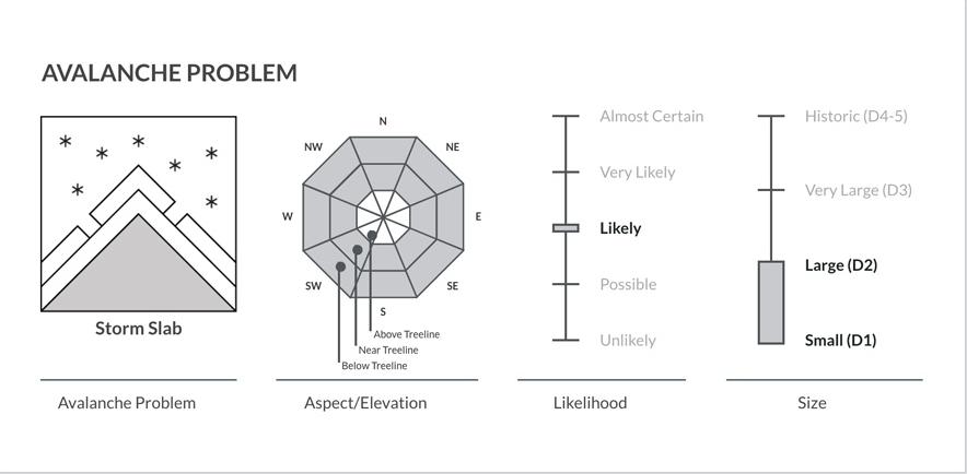After a summary written by an avalanche forecaster, a more specific danger assessment follows. It consists of four main parts: Avalanche character, aspect/elevation, likelihood, and size. Below is a breakdown of what each part means when reading a forecast.