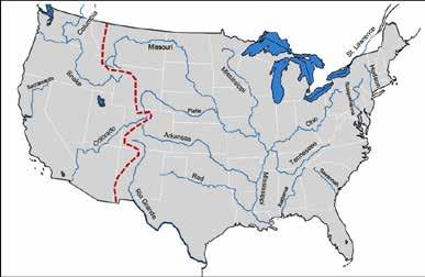 The Great Continental Divide separates North America’s principal drainage basins. A drainage basin is an area from which a major river collects water and sediments from tributaries that have smaller tributaries, and they have tributaries that are smaller yet, and so on. The largest American drainage basin is the Mississippi River basin on the east side of the divide, the Colorado River and Snake River basins are the prominent drainage basins on the west side of the continental divide (Figure 3).