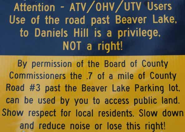 sioners lived on this side of the mountains, the severity of the problem would have already been recognized. Commissioner Liz Smith can testify that it was hard to be heard over the roar of the ATV loading station during a meeting held last September at the Mill Site Park. See the photo of a County-placed sign which explains how the County is complicit with the ATV damage to our environment, community, and quality of life.