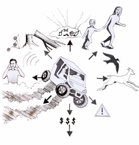 Damage to vegetation results from vehicles that do not stay on established paths. Everywhere that native vegetation is killed is replaced by weeds, which then spread and take over the natural plant communities. To maintain a natural environment after disturbance requires weed control and revegetation, expenses imposed on the town and the forest.