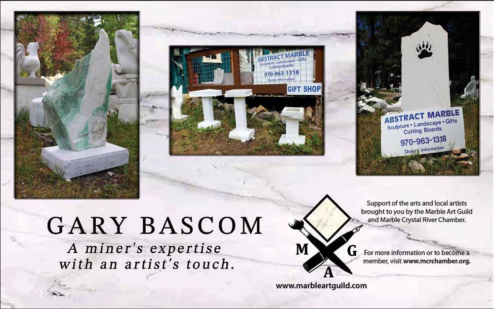 Bascom’s worked on projects big and small from the Roden Crater, an 80-foot sphere inlaid in marble located in Arizona, to the birdbath you’ll be wanting in your garden after stopping by to browse. In addition to artistic endeavors, his strong civic and community mind has led him to volunteer for the Marble Fire Department (one of the best in the state in his opinion), serving on the Town Board of Trustees, being an avid member of the Marble Historical Society, and found time to raise two daughters in between.