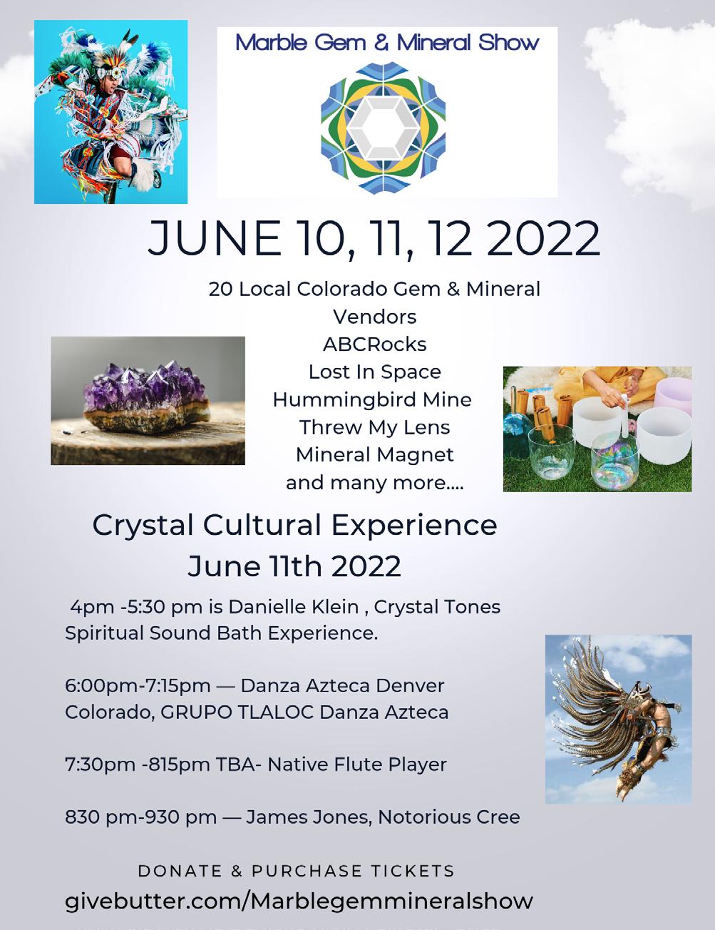 The stage is set on private property alongside the Crystal River with spectacular views of Whitehouse and Treasure Mountains and surrounds, therefore, seating is limited. Purchase your tickets and donate online at givebutter.com/marblegemmineralshow or call Monique Villalobos at (970) 456-6059 for more information.