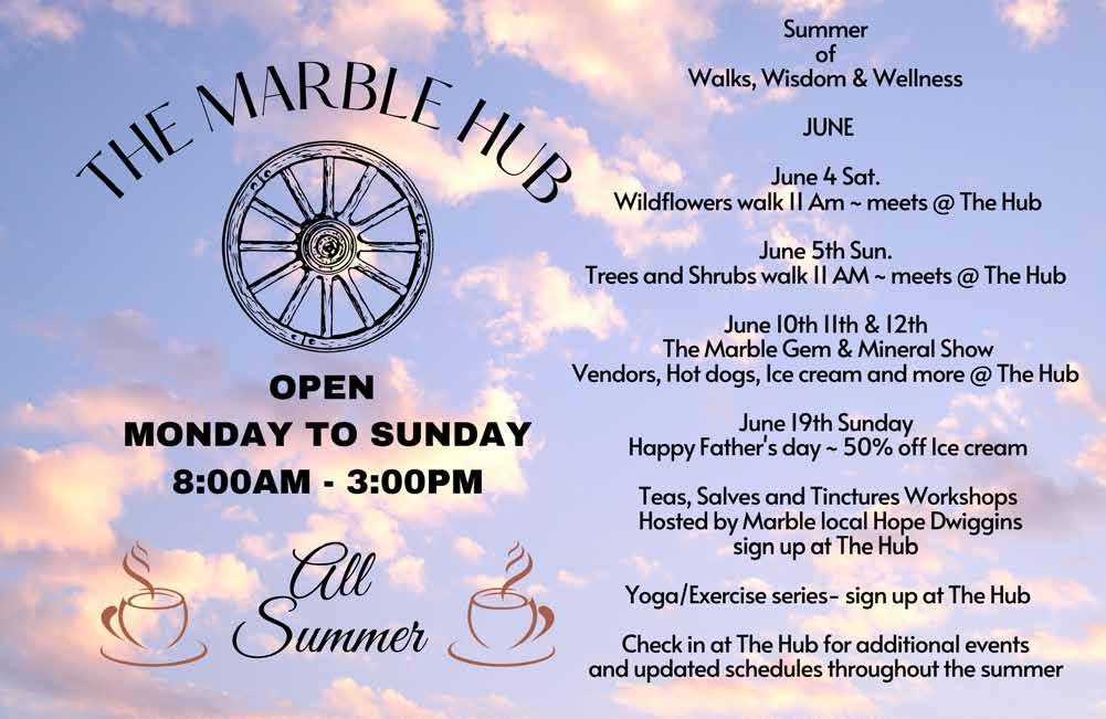 Historic Walking Tours of either the town of Marble or the historic Mill Site leave The Marble Hub weekly Friday - Sunday at 1 p.m. These are an easy, hour and a half walk. The Marble Museum is now open 11 a.m. — 3 p.m. Friday - Sunday and opens daily 11 a.m. -- 3 p.m. starting in July. Admission for both the museum and walking tours are $5 for adults, $3 for teens and seniors, and kids are free.