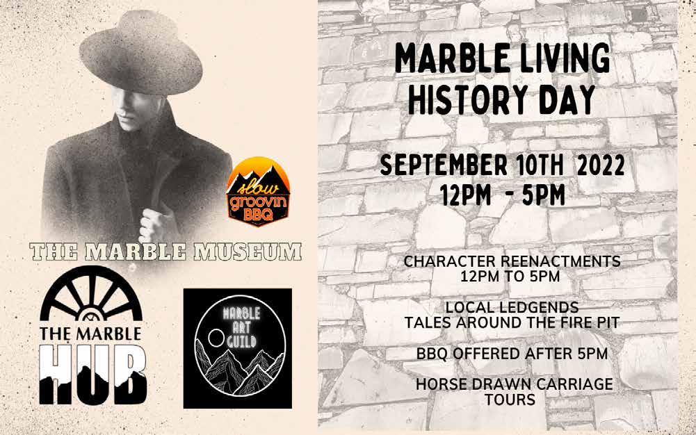 The Third Annual Living History Day event will be held in Marble on Saturday, September 10th from 12 p.m. to 5 p.m. followed by a BBQ. The event features recreations of historical characters acting out scenes in actual locations all around town. The cast of characters includes an industrialist ' Robber Baron,' miners, bootleggers, a hermit school teacher, a world-famous ceramicist, stone masons, the quarry master, the minister, a socialist journalist who is run out of town on the rail, fur trappers, Native Americans, and other townspeople.
