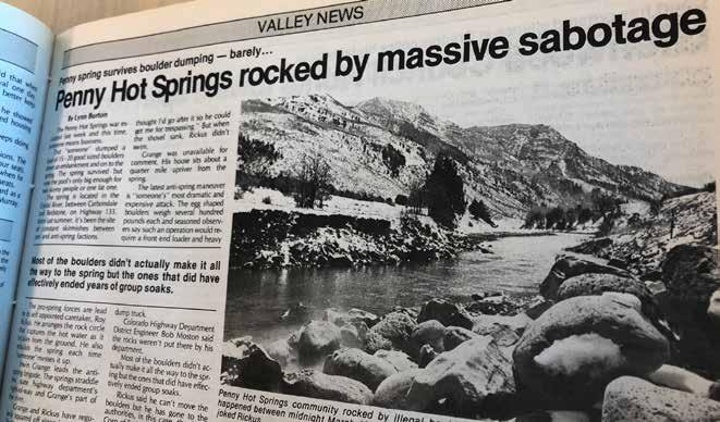 Back then the water was plentiful and the sides of Highway 133 had four to five-foot snowbanks during winter. In the spring the rush of snow melt water thundered down the valley and you could hear big rocks bouncing along the bottom of the river bed. During summer we would slide down upper Hayes Creek Falls, jump off dinosaur rock into a deep hole just north of Redstone and, for some of us, take off our clothes and slip into the healing, warm waters of the “Hippie Dip” (now more popularly known as Penny Hot Springs).