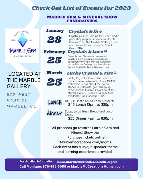 In Marble, the Marble Art Guild continues its work by highlighting local artists and offering free classes. Larry Good at the Beaver Lake Lodge started hosting Songwriter Nights again after a two-year hiatus due to COVID. In August, Marblefest once more took over the Mill Site Park, bringing local Colorado talent into the spotlight and keeping the people of the valley dancing well into the evening.