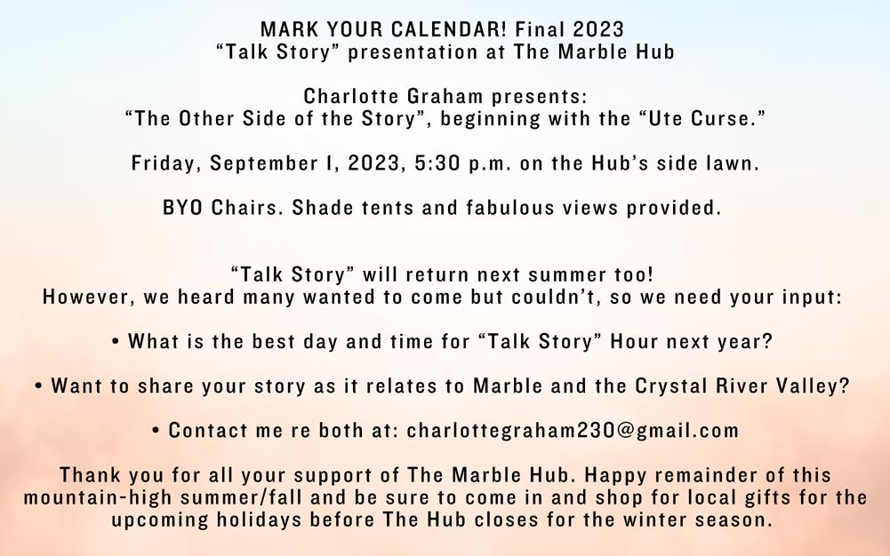 Settlement of the Crystal Valley downstream of Marble, Colo., all the way to Carbondale was contemporaneous with Marble's beginnings and with the removal of the Utes after the Meeker massacre. In fact, almost all of the desirable ranch land in the valley was taken up during the early 1880s.