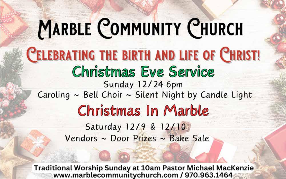 I'm signing off by wishing Happy Holidays to all our readers with a big thank you to the Board of Trustees and Administrative Staff whose hard work makes Marble such a wonderful place to live. See you in the New Year!