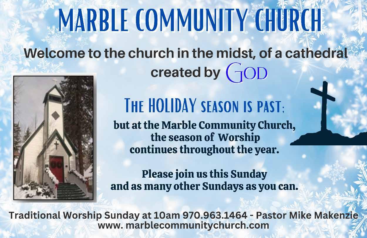 This recap simply discussed major themes addressed throughout the year during the Town of Marble Board of Trustee meetings, and many issues did not make the cut due to space constraints. Marble Trustees are comprised of a board of volunteers taking on a variety of issues; meetings are held at 7 p.m. in the Marble Community Church’s Fellowship Hall on the first Thursday of every month and agendas can be found before the meeting by visiting www.townofmarble.com
