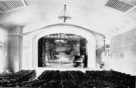On the third floor is the theater, equipped with stage scenery and drop curtains painted by good artists, dressing rooms, electric lights, and an arc illuminant stereopticon.
