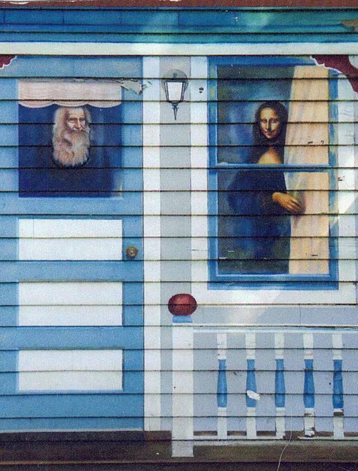 I asked Bill Jochems about it, and he said, “Bob had done some work for me and asked me if I’d mind him painting a portrait of Mona Lisa on my house. I didn’t, so he painted not just her but a window, porch, and curtain, and the finished product was so perfect that there was no way to tell from the Boulevard that it was painted on clapboard siding. A perfect trompe l’oeil. He later added Da Vinci’s face, but it’s all been painted over now, except for their faces.”