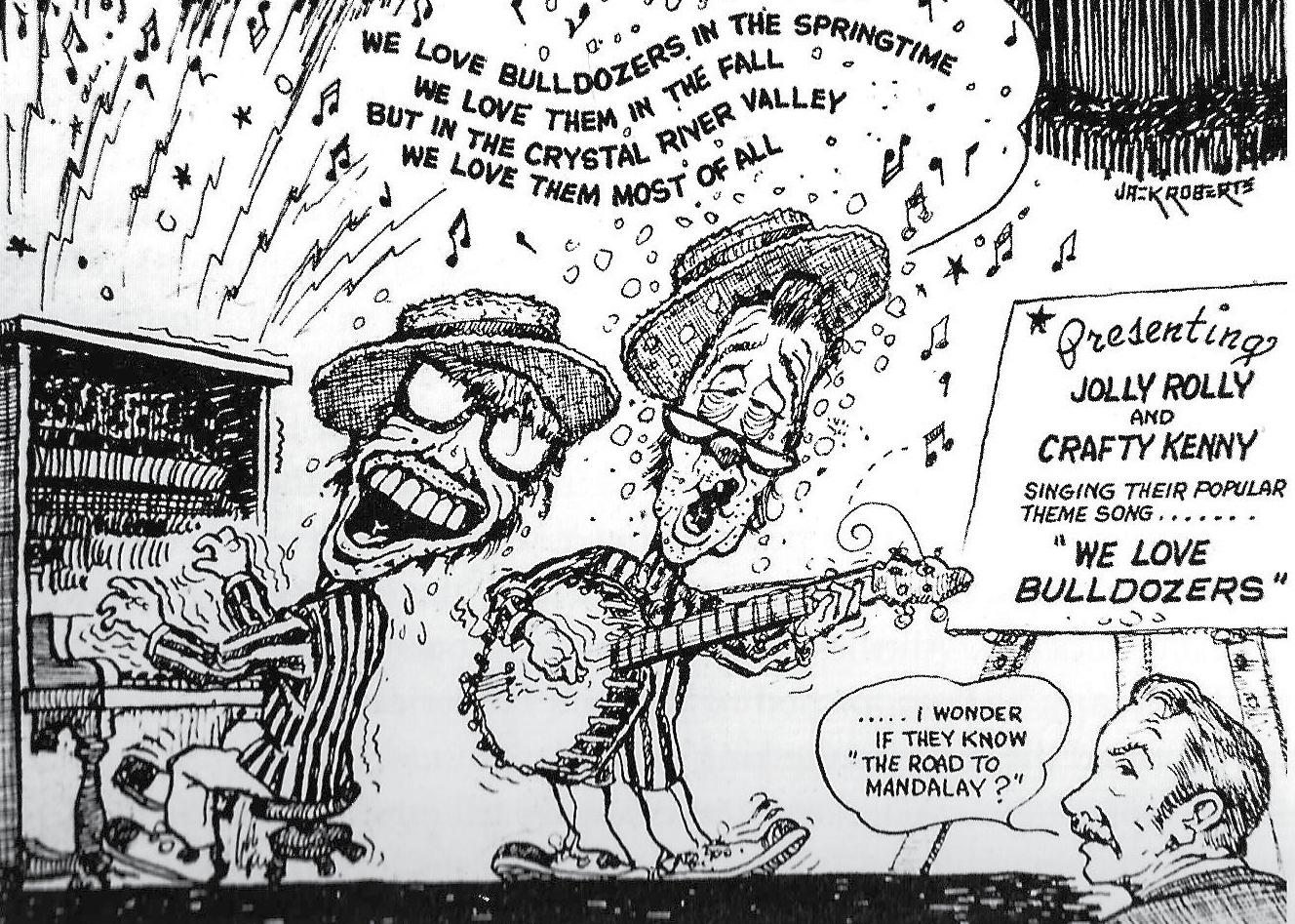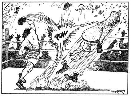 Two major issues he took on were the proposed Marble Ski Area Development and the Placita Dam/West Divide Water proposal. Both threatened the outdoor environment along the Crystal River, and both became targets of his satirical cartoons. Real names became recognizable spoofs: Crafty Kenny, Jolley Rolly, & Shifty Scotty. Although the cartoons provoked anger in some circles, they were also credited with making effective points against the developments. The Crystal Valley Environmental Protection Association (CVEPA) still uses some of these cartoons.