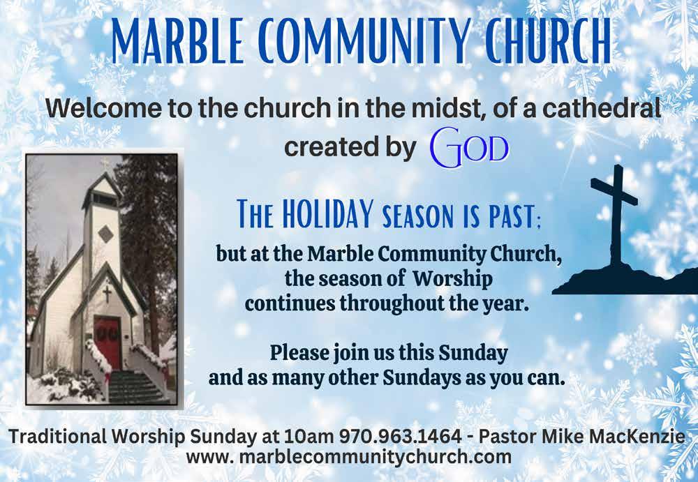 ing.” Mayor Vinciguerra admitted that the Town of Marble had a lot of projects on its plate and recognized the need to “prioritize and get organized” for 2025. McMahill promised to reach out to Gunnison County to seek their assistance.