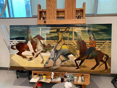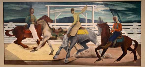 of the West that Mechau knew intimately. He elevates western life to a grand scale on a canvas that measures over three feet by seven feet. The inclusion of “Rodeo #1” in the Whitney Biennial boldly declared not only the vitality of the American West but also the importance and viability of Western subjects in modern American art.