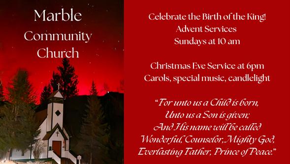 The next Town of Marble Board of Trustees meeting is scheduled on December 4th at the Marble Community Church's Fellowship Hall beginning at 6 p.m. At the time of publication, the first meeting of 2026 is scheduled for January 1st; however, a date change will be discussed during December’s meeting. As always, the Town of Marble website, www.townofmarble.com, has the most up-to-date information regarding meeting dates, agendas, and minutes. See you next year!