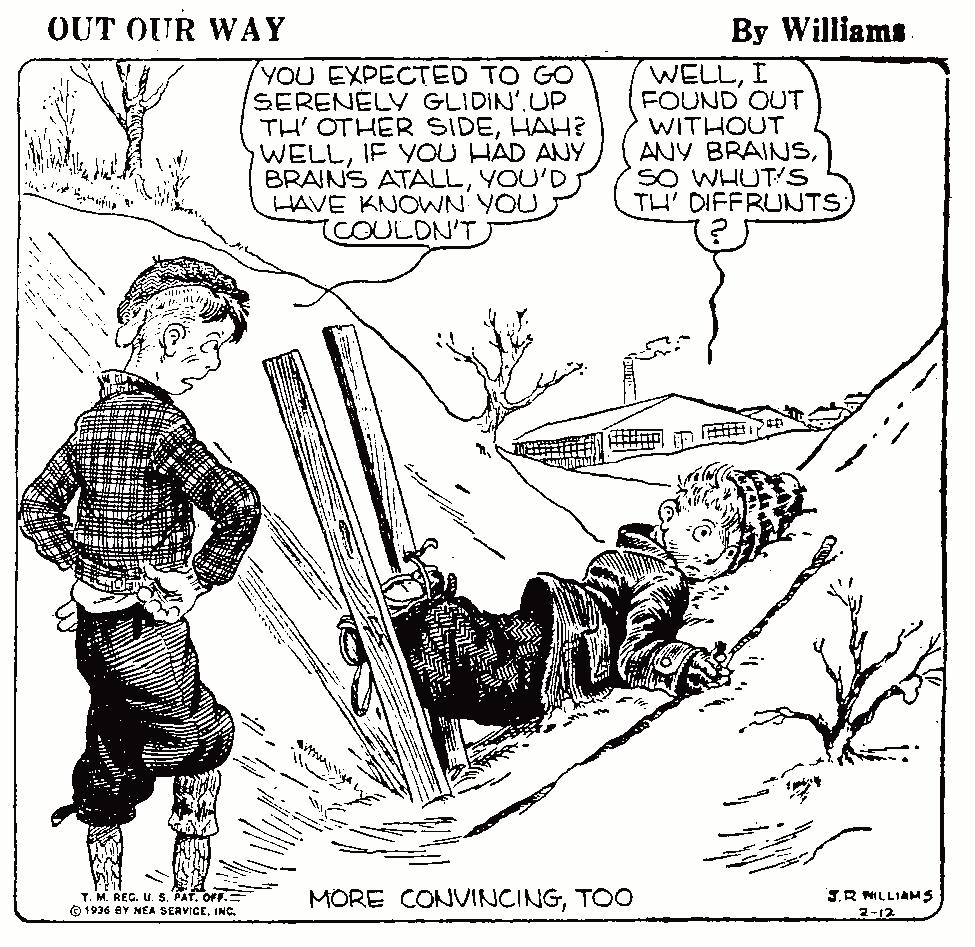 This Month's Inky Ledger feature is a daily single-panel comic strip titled "Out Our Way" by Canadian-American artist J.R. Williams. The strip ran from 1922-1977 and was featured in hundreds of newspapers over its long run. The strip was popular for its depictions of rural life in America, and tied a sense of relatability in the daily lives of its readers. This panel was featured in US newspapers 90 years ago in 1936.