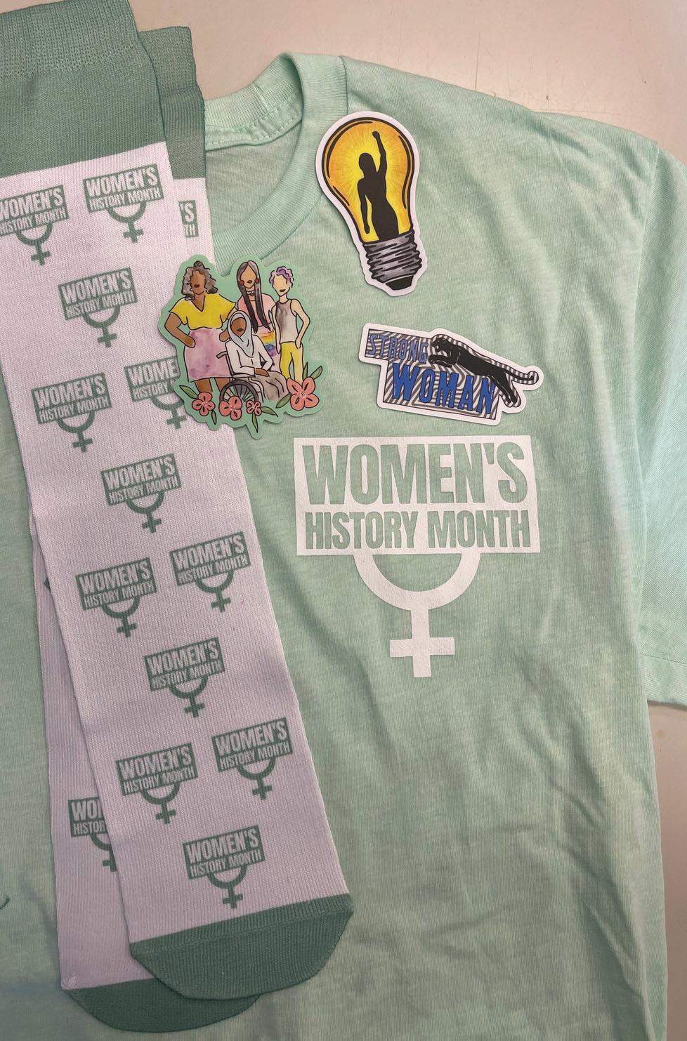 ForWomen’sHistoryMonth,civicfellow Victoria M. Evens, and student coordinatorLaurelPoole'21organizeda sticker design contest to involve localartists.Studentsandcommunitymembers were challenged to design theirownstickerrelatingtowomen’sempowerment and were drawn to win aprizebasket.Thebasketincludedacopy of Ruth Bader Ginsburg's InHer OwnWords,ChimamandaNgoziAdichie's WeShouldallbeFeminists,a giftcardtolocalbakeryFlourandFlower, and a pack of their own stickers. Thecontestwasafunwaytoremindstudents about women’s month and see whatitmeanstothem.CSBstudent,Katie Sohm'21, and community members Lily Brutger and Jennifer Evens wonthestickerdesigncontest.Tocontinuethet-shirtseries,Evensstarted designing Women’s History Month t-shirtstotablewithduringMarch.While meeting, Director Matt Lindstromsuggested the idea to collect donationsforthet-shirtsandputthemoney towards an organization that does beneficial work within the community.WedecidedthatAnnaMarie’s Alliance would use the funds to better promote women’s rights. The t-shirthadthewomansymbolwith“Women’s History Month” integrated within. Evens also designed socks to goalongwiththeshirts,theymatchedwith the white and green design.