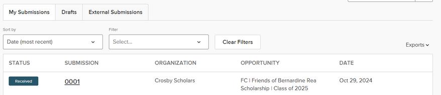You will see a full list of all scholarships that you have applied for, and the status for each application. You can also select “Drafts” to view and work on scholarship applications that you have started, but not have submitted.
